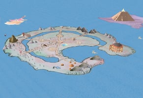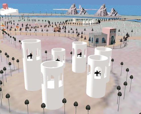 Memory Island is a virtual world built with memories and drawings from six young adults with cerebral palsy. The island is based on an illustration of Thomas Moore's Utopia, the structures are from Giotto's frescoes depicting the lives of the saints.