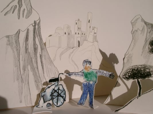 Victor's story included him practicing walking, holding onto his wheelchair. Here are scenes of work in progress, combining Victor's self-portraits with my own drawings and the model cyprus trees from Victor's home and Giotto's.