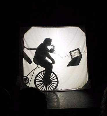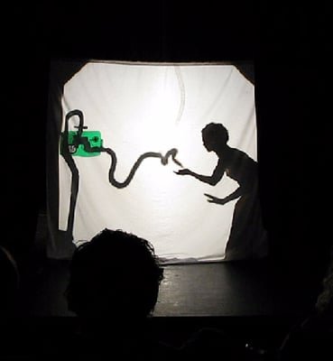 During a residency at Royal Brompton Hospital I met patients with cystic fibrosis. They had to deal with being connected to so many lines and tubes, primarily supplying oxygen. I made paper articulated figures in situations playfully connected with gases and air. Backlit photos of these images were printed onto acrylic panels and installed on the Victorian staircase leading to the ward. Assisted by Zsuza Kohan I developed this 15 minute piece which we performed at the hospital and at Jacksons Lane Theatre, London, music was by Victoria Hume.
