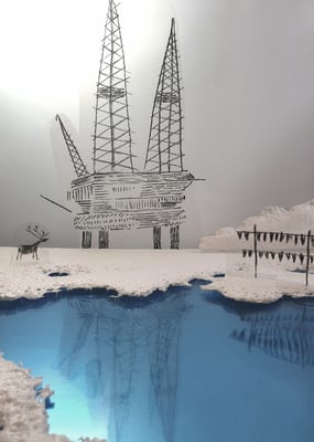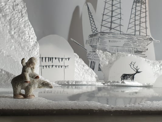 I explored the Alaskan tools, covered in fabulous Scrimshaw carvings. After trying various materials I made drawings on recycled acetate to populate polystyrene packaging snow scenes in my Victorian toy theatre.