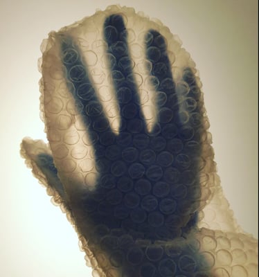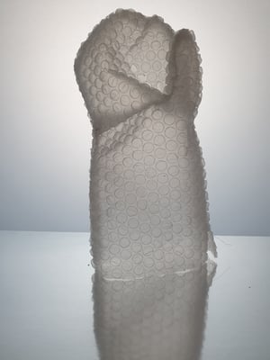 Bubble wrap mittens contrast the museum curator's gloves with those worn by the Artic peoples. Using plastic waste makes reference to the man made changes, disproportionately affecting the Artic.