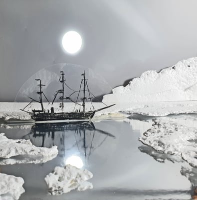 The scrimshaw engraved tools at the Sainsbury Centre and the British Museum have inspired inspired these scenes built in my vintage toy theatre. I am re-using discarded architect's drafting film, second hand acetate with water based crayons and polystyrene packaging provided (much to my annoyance as you can't recycle it) by John Lewis.